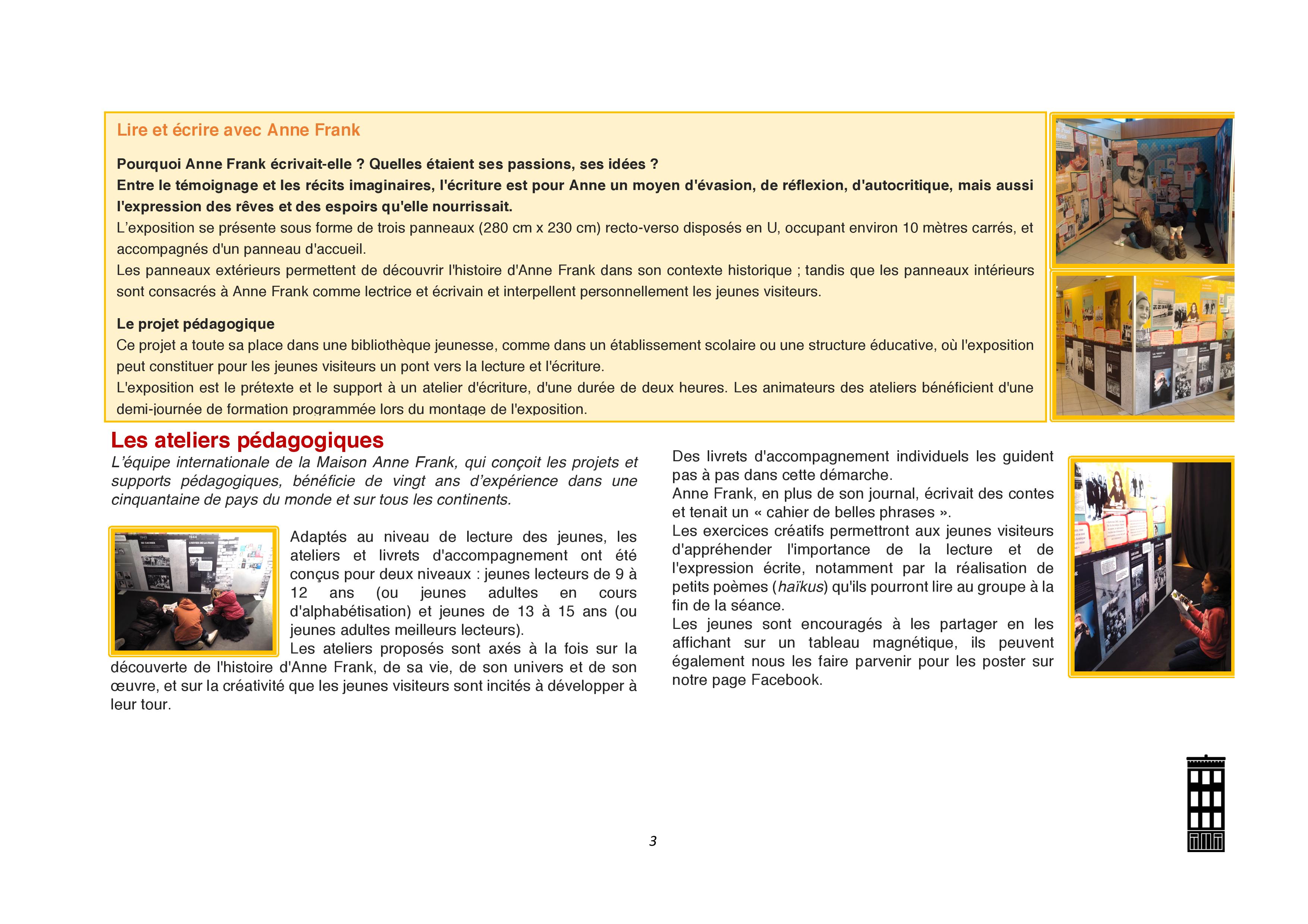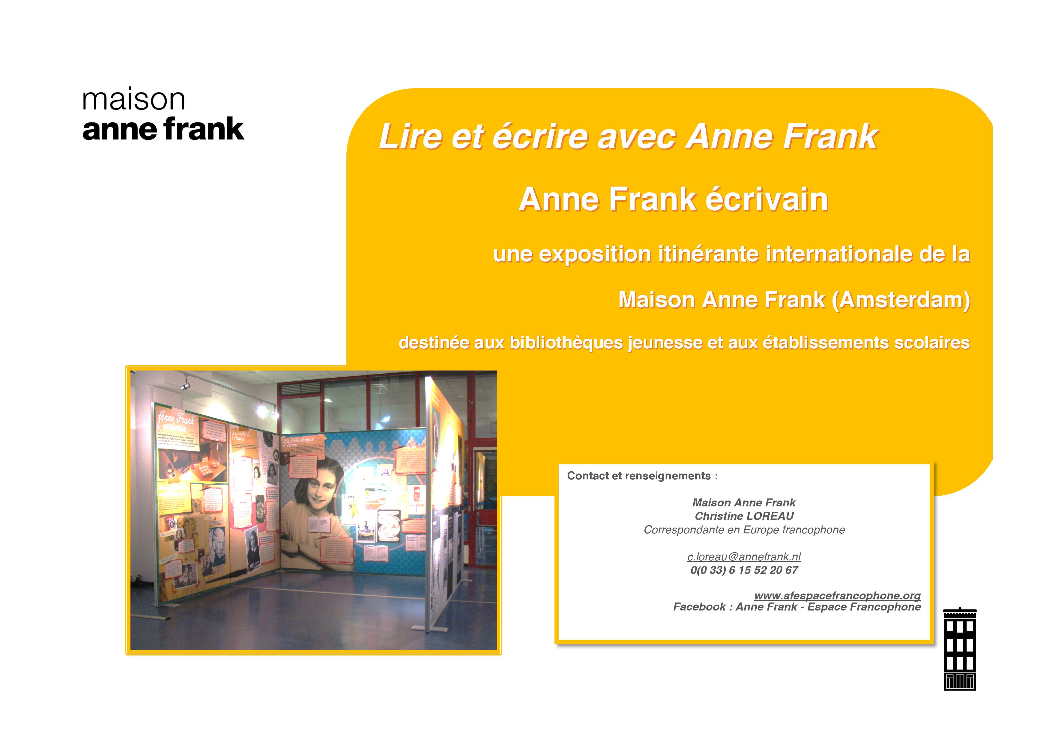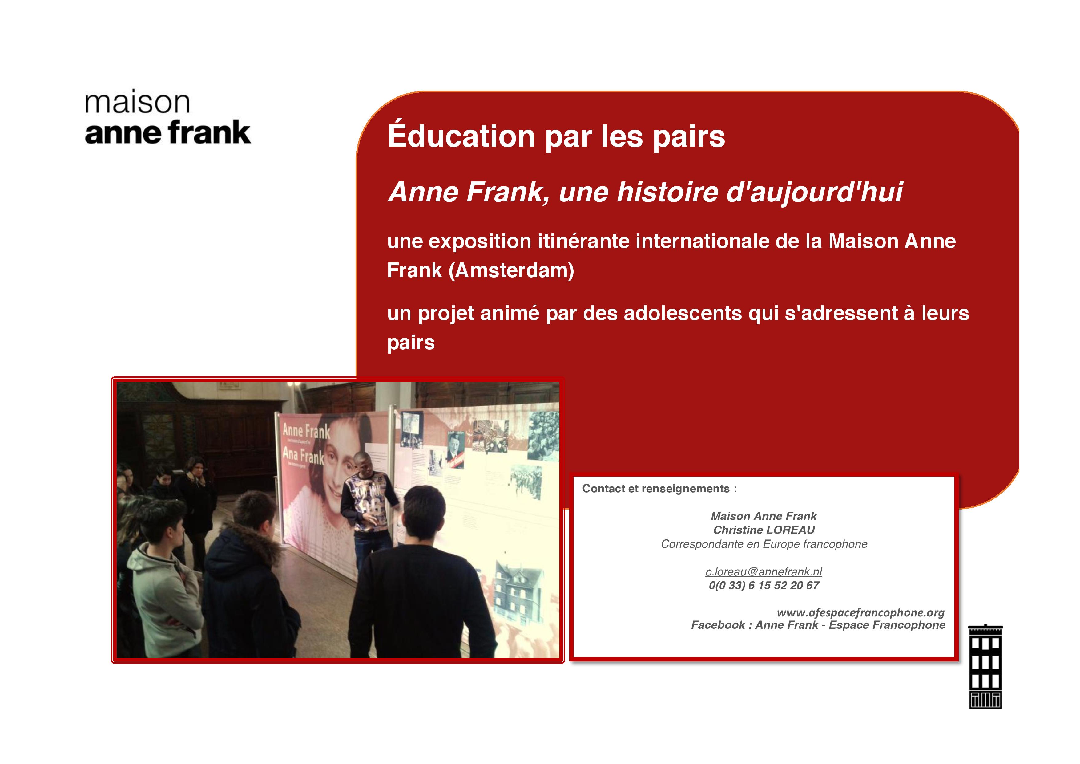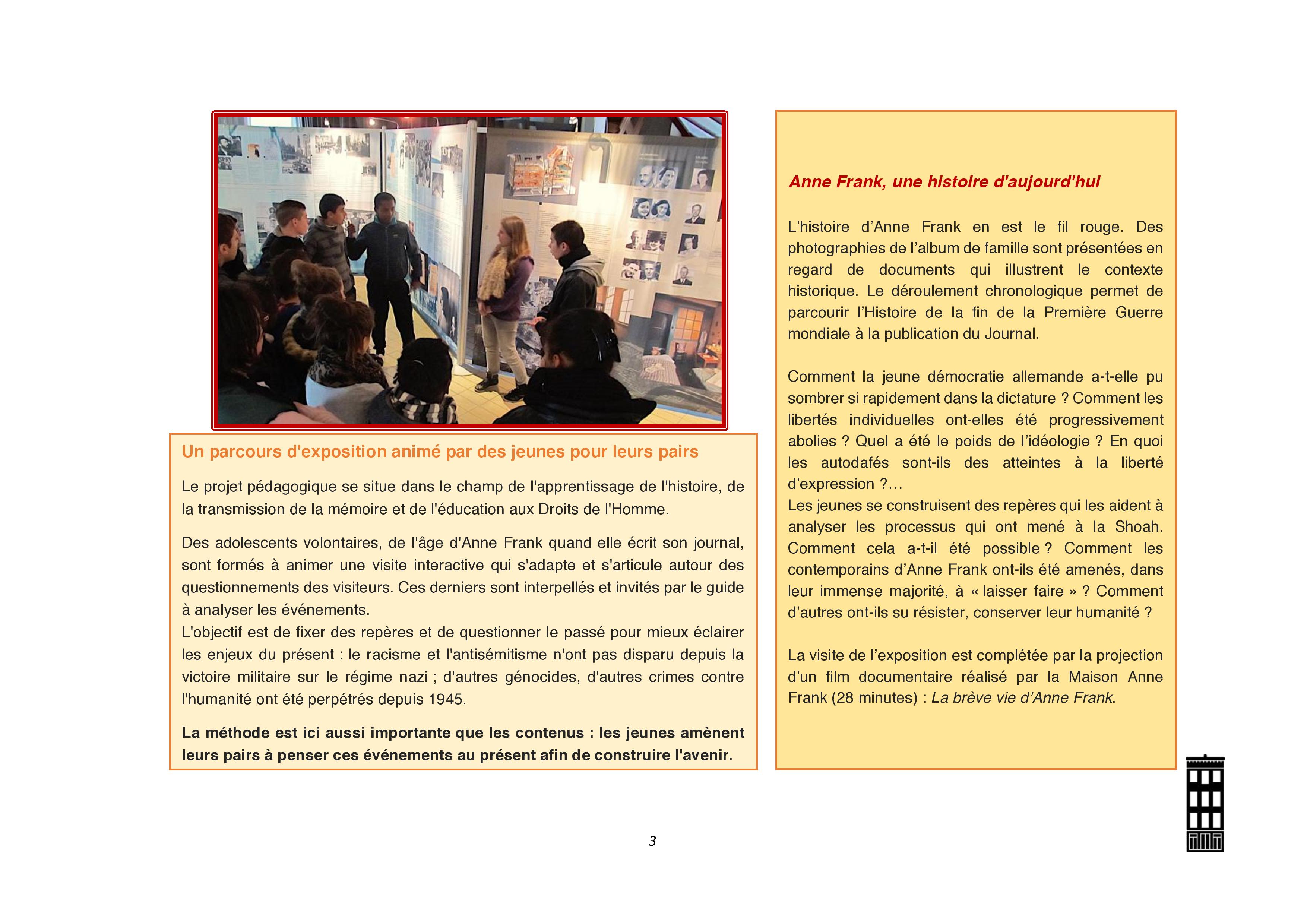 L'exposition Anne Frank, une histoire d'aujourd'hui est le support à des visites guidées animées par des jeunes de l'âge d'Anne Frank quand elle écrivait. Un projet destiné aux établissements scolaires, centre sociaux, MJC, Maisons de quartier et groupes constitués d'adolescents.
