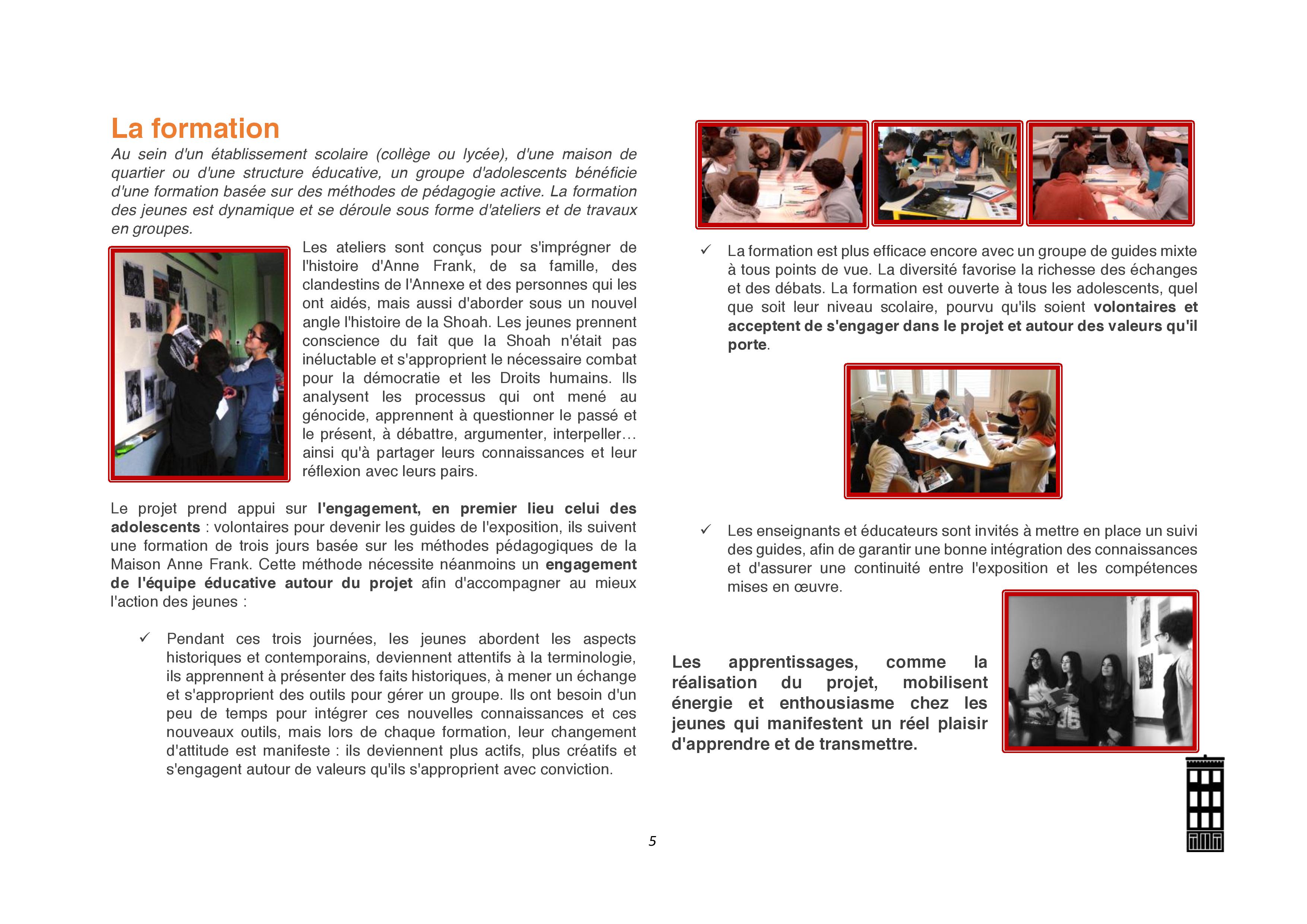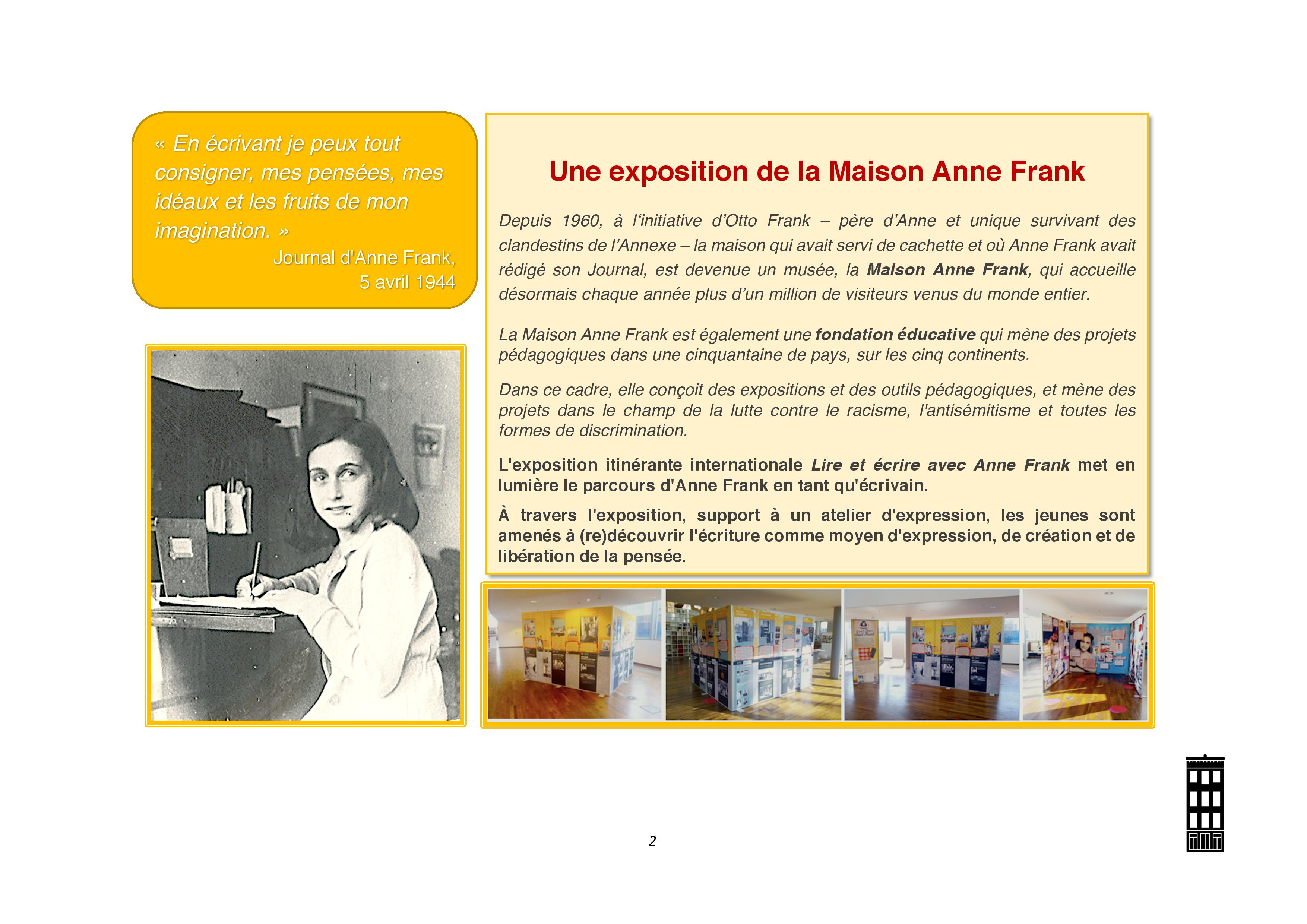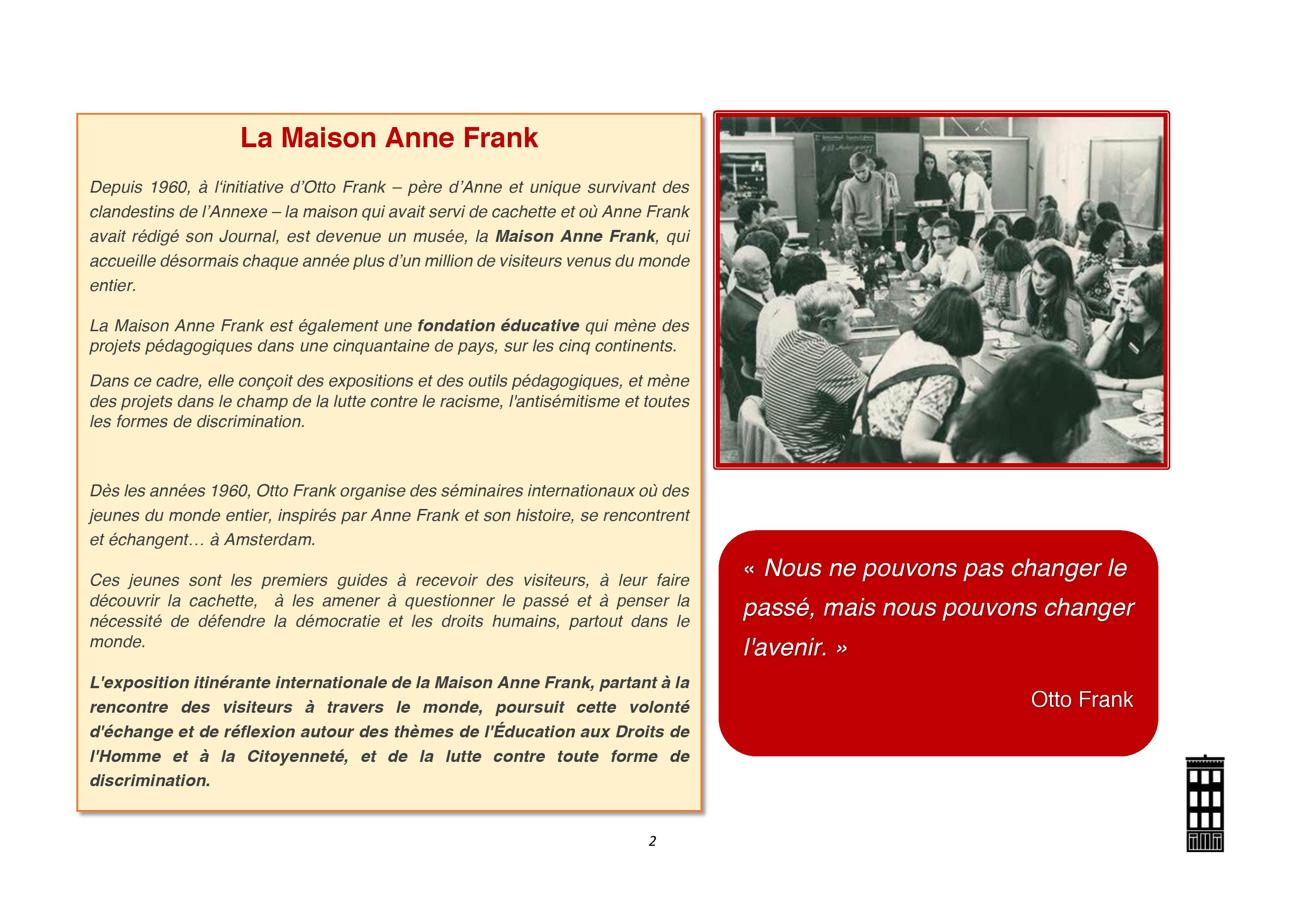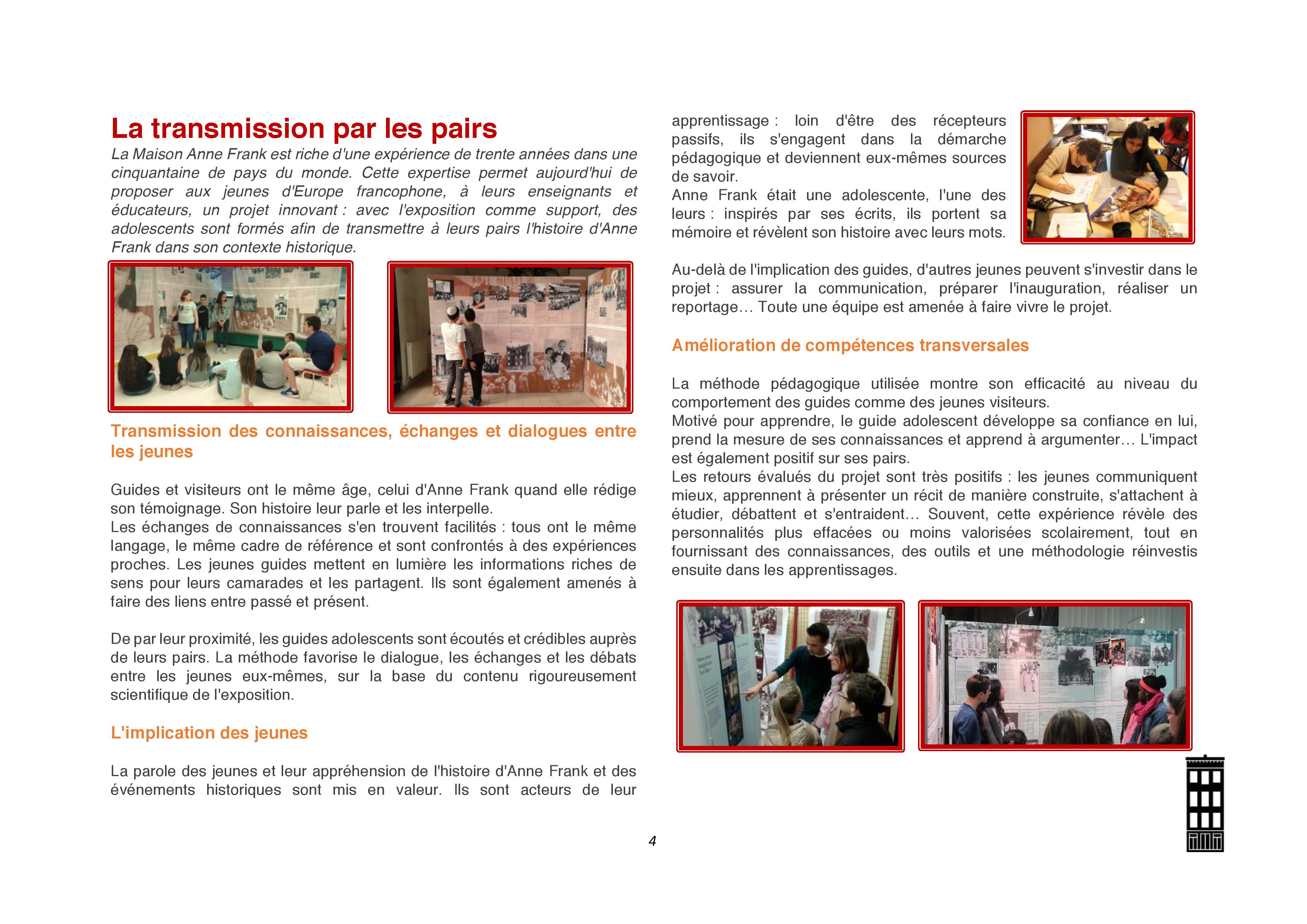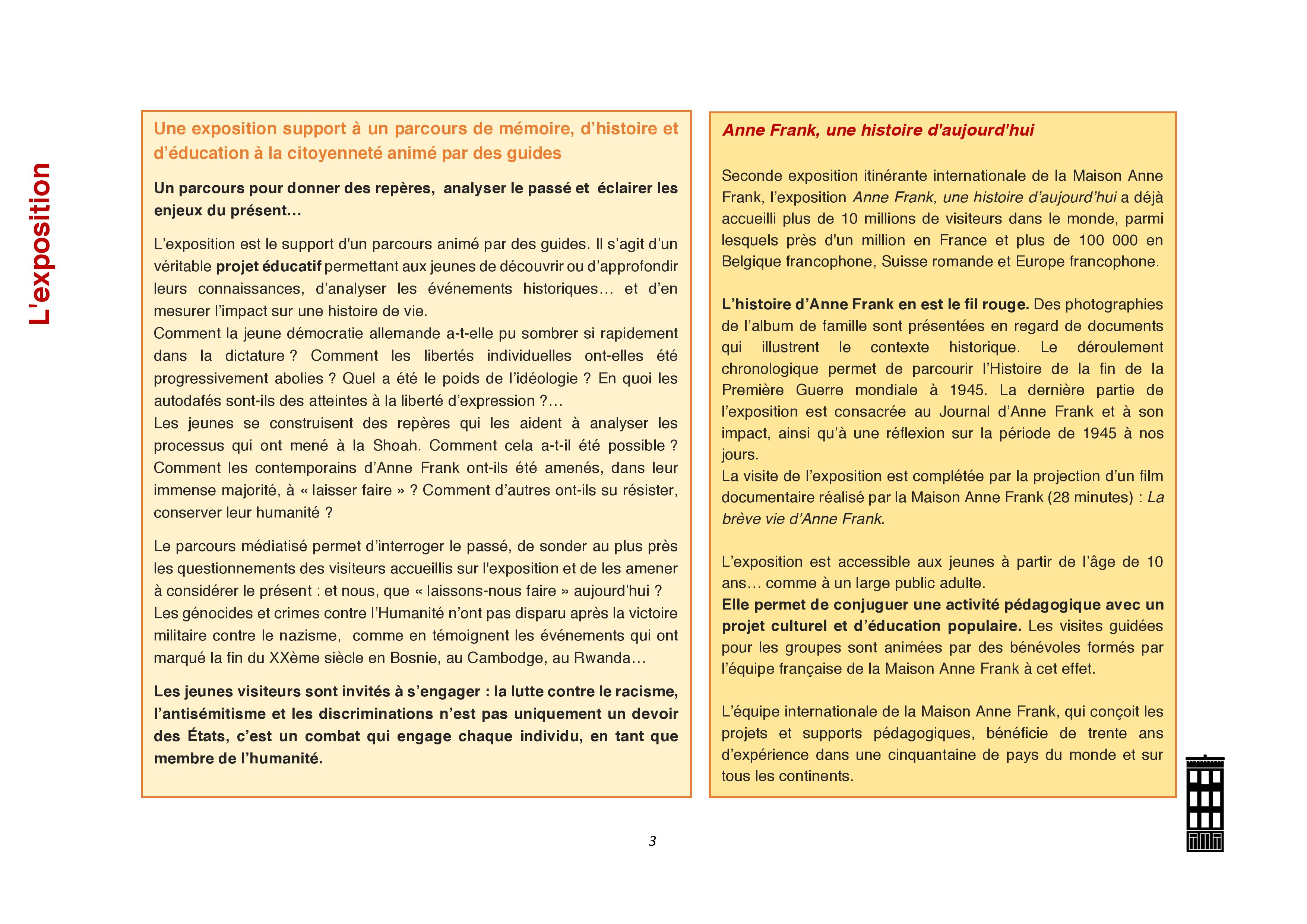 L'exposition Anne Frank, une histoire d'aujourd'hui est le support à des visites guidées animées par des jeunes de l'âge d'Anne Frank quand elle écrivait. Un projet destiné aux établissements scolaires, centre sociaux, MJC, Maisons de quartier et groupes constitués d'adolescents.