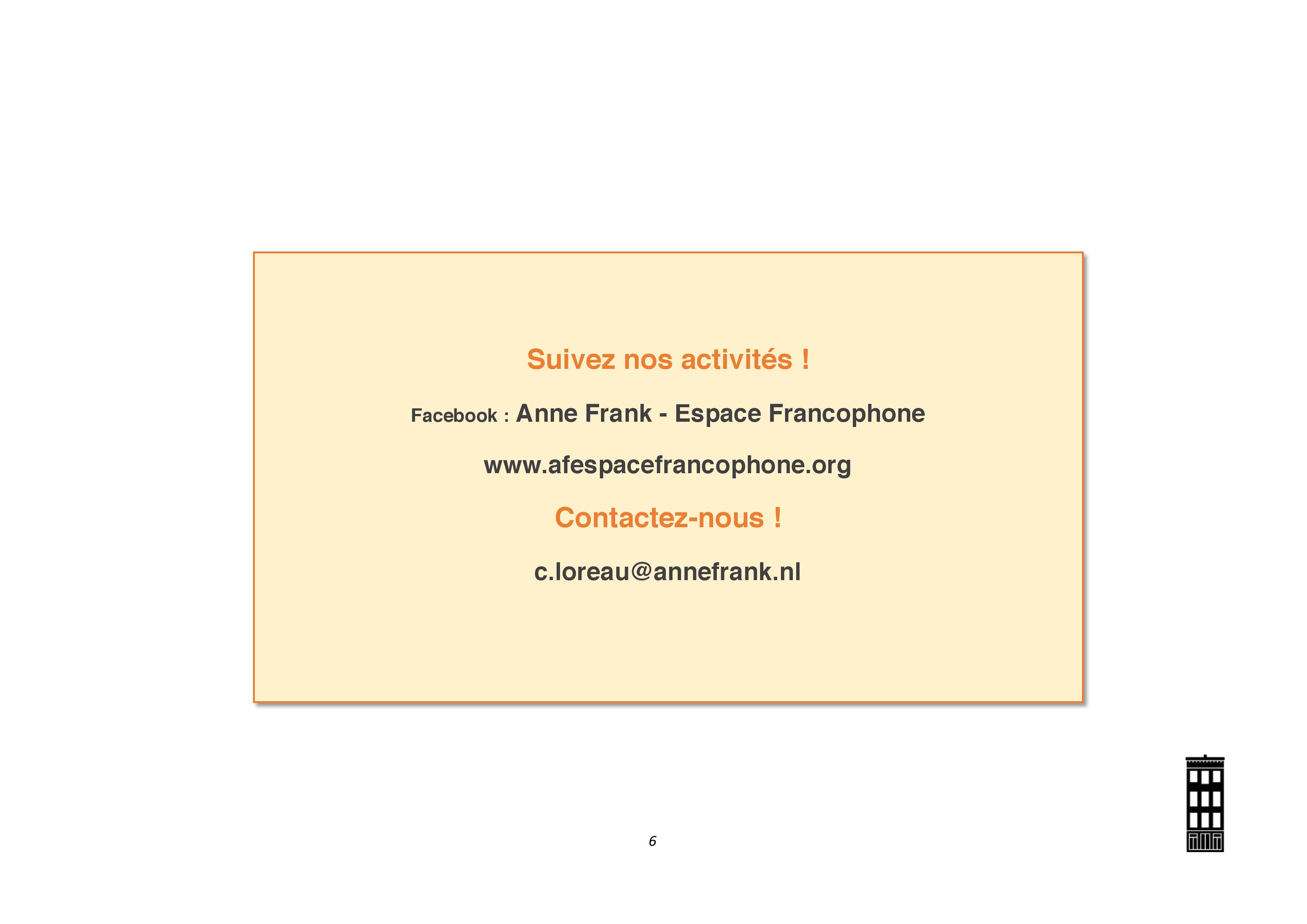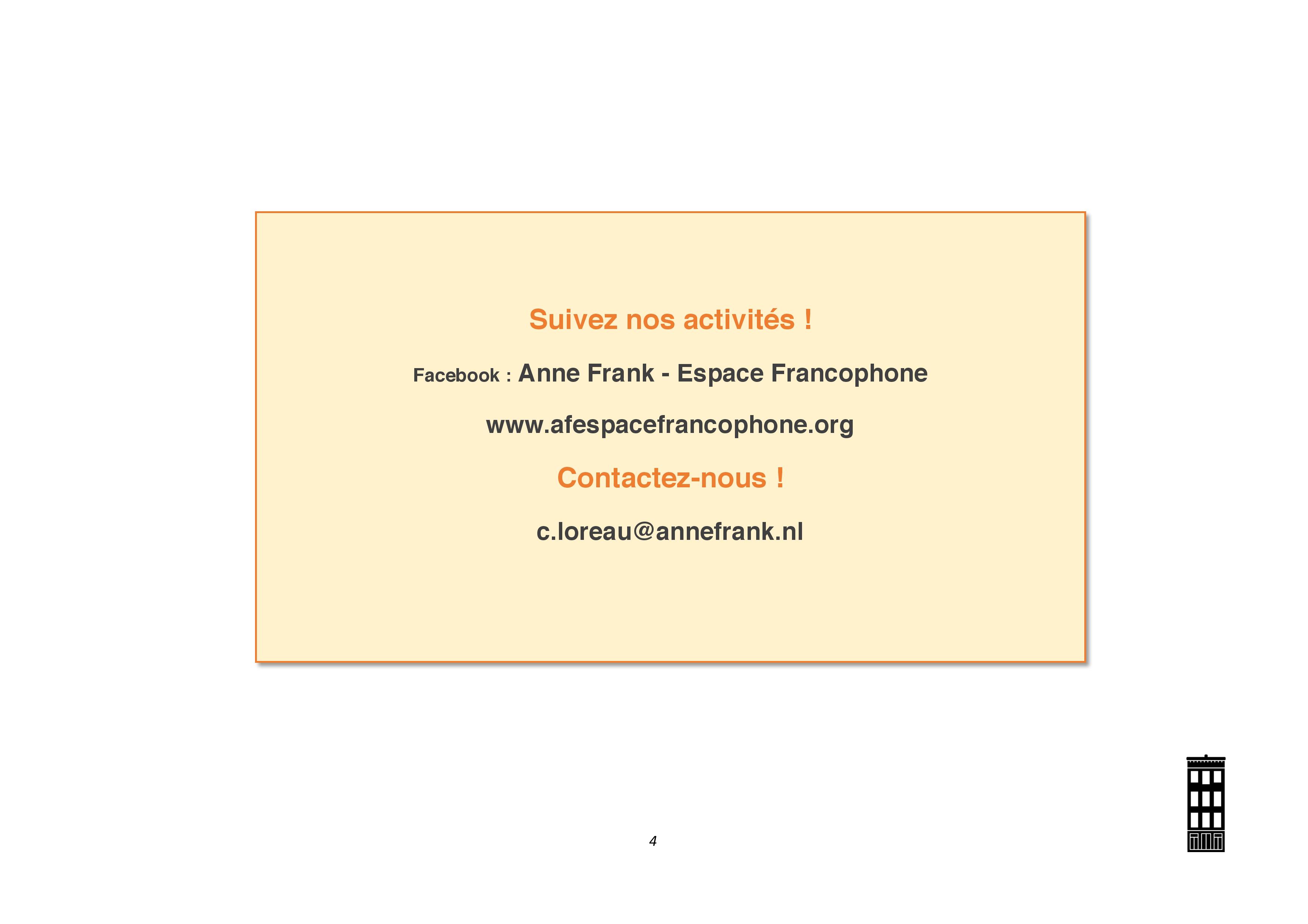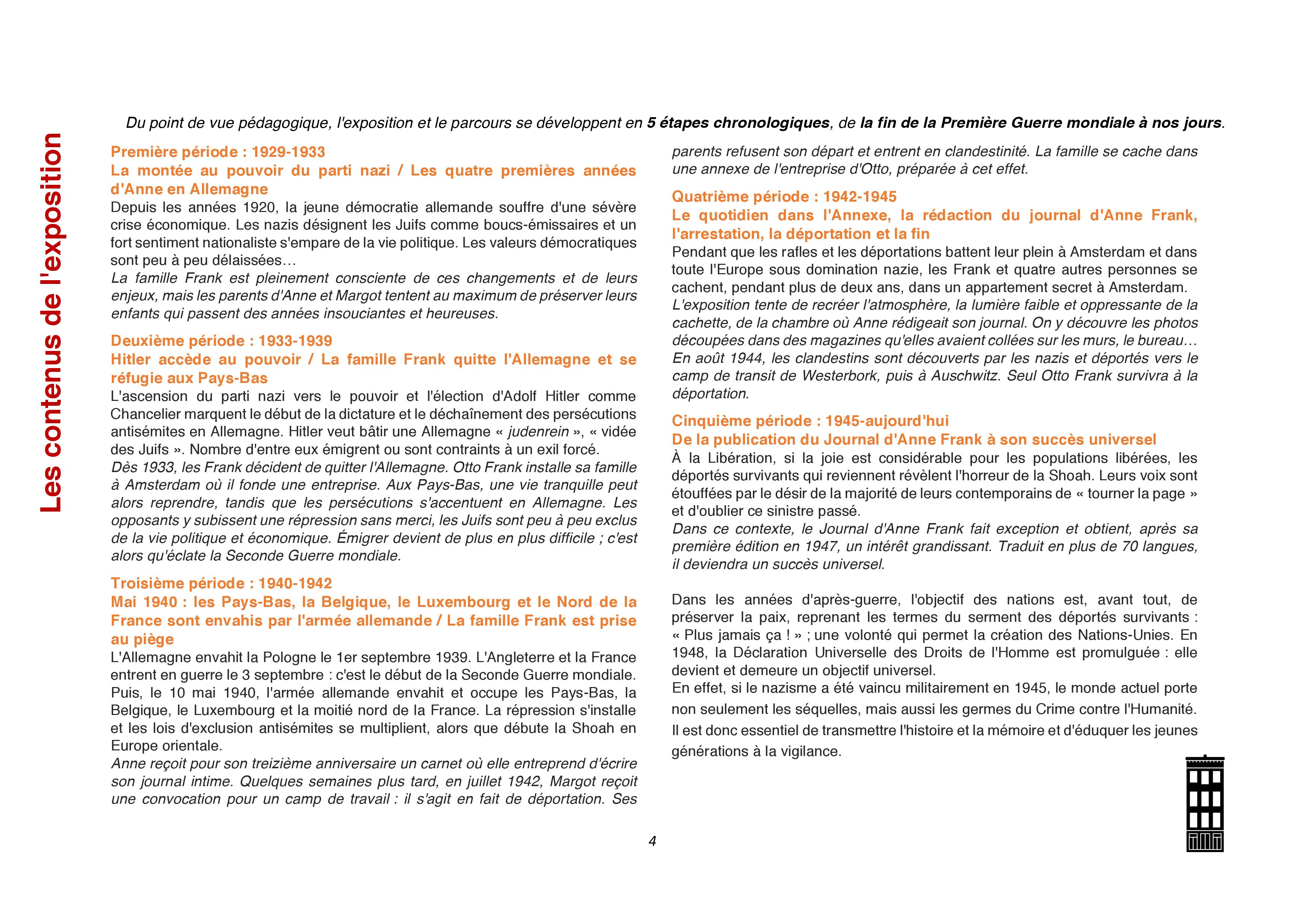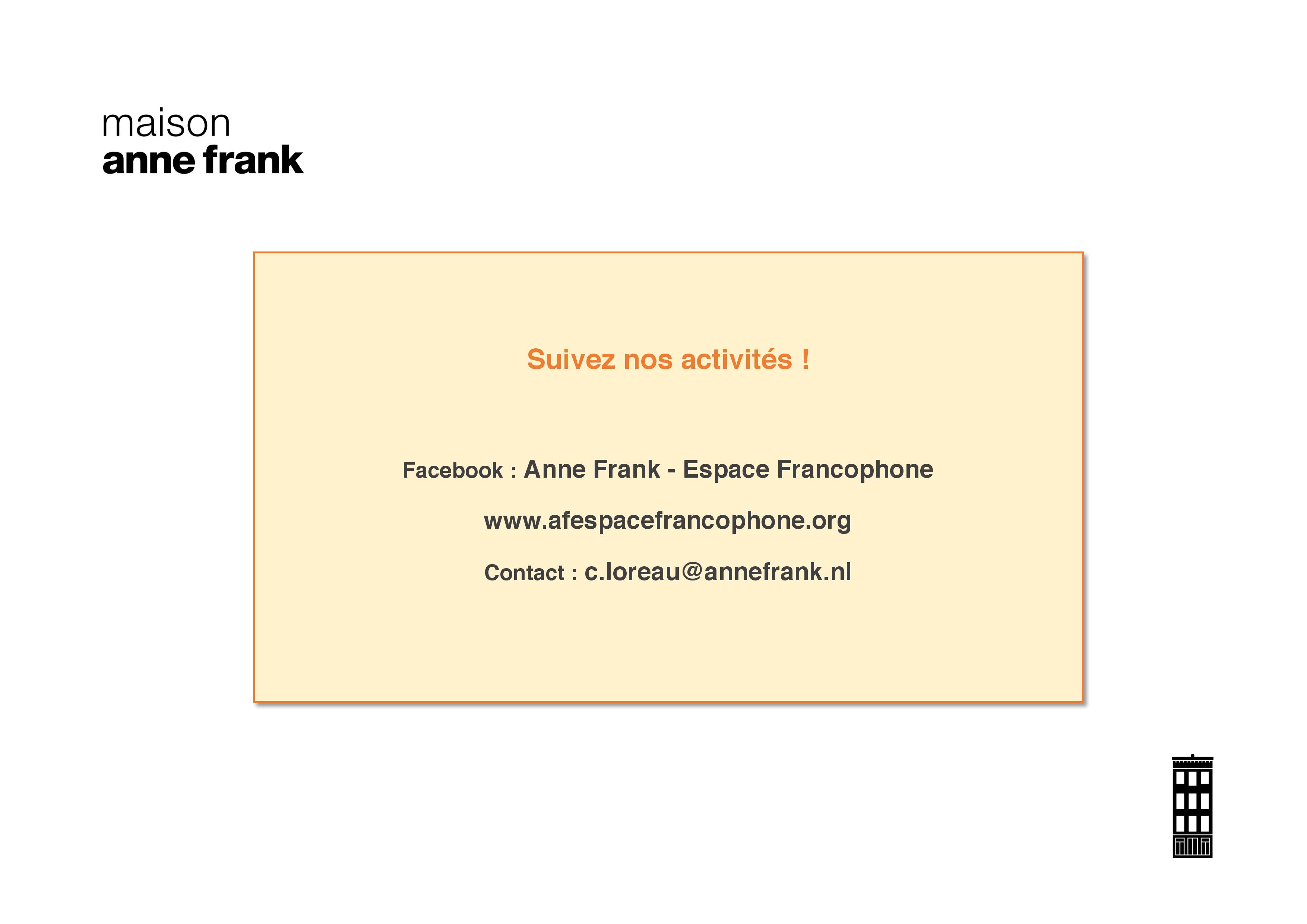 L'exposition Anne Frank, une histoire d'aujourd'hui est le support à des visites guidées animées par des jeunes de l'âge d'Anne Frank quand elle écrivait. Un projet destiné aux établissements scolaires, centre sociaux, MJC, Maisons de quartier et groupes constitués d'adolescents.